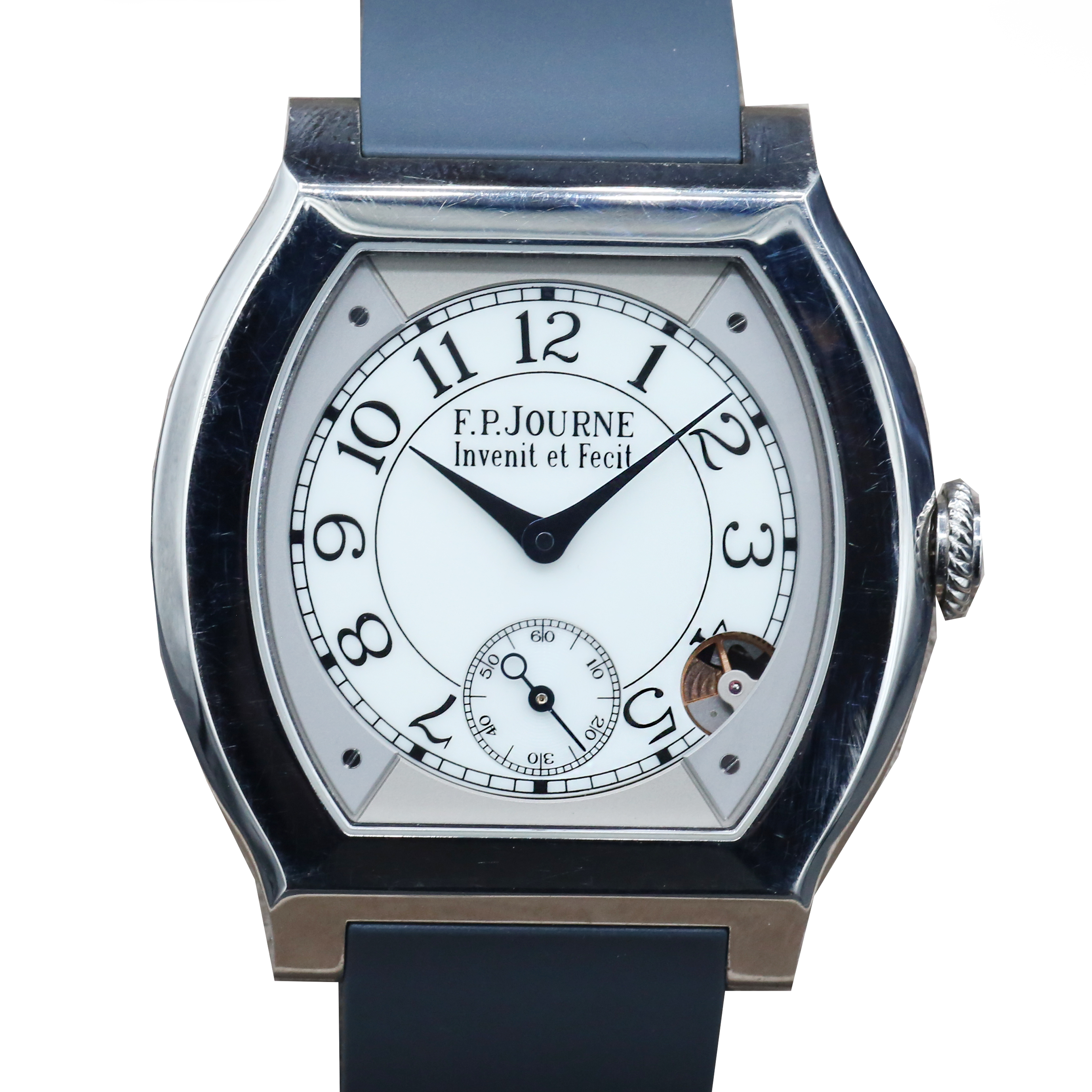 Diese spezifische F.P. Journe Elegante EL TIT 40 hat ein weiß arabisch ziffernblatt mit einem kautschuk armband. Diese F.P. Journe wurde einer gründlichen Prüfung der Wasserbeständigkeit, Genauigkeit, Funktionalität und des Zustands unterzogen, um den Grad der Überholung zu bestimmen, der zur Einhaltung unserer strengen Standards erforderlich ist. Sie wurde auch mit technischen Dokumenten und Herstelleraufzeichnungen verglichen, falls vorhanden, um Echtheit und einen einwandfreien Werdegang zu gewährleisten. Zu Ihrer Sicherheit verfügen alle unsere Uhren über eine 24-monatige Garantie.