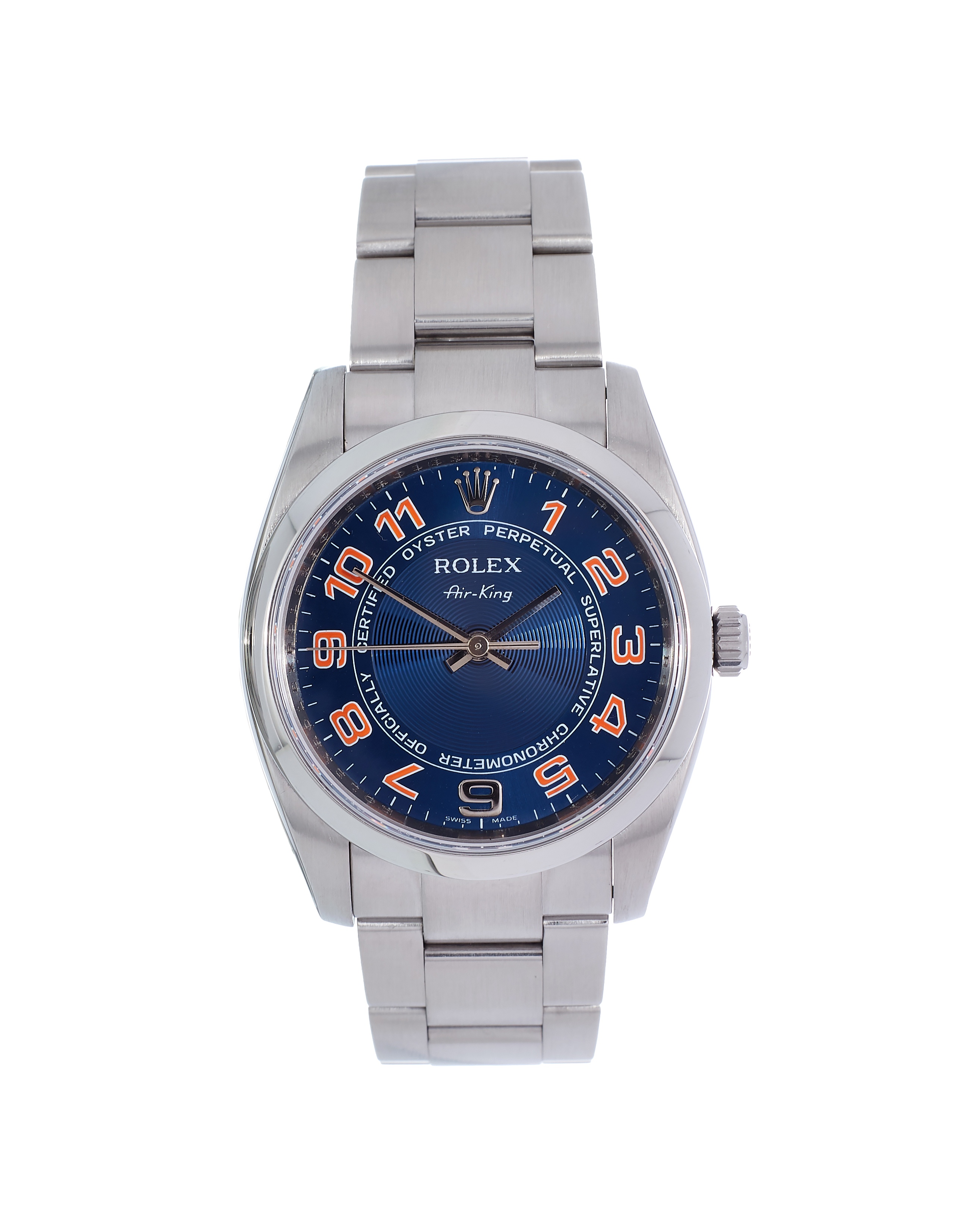 Diese spezifische Rolex Air-King 114200 hat ein blau arabisch ziffernblatt mit einem metall / keramik armband. Diese Rolex wurde einer gründlichen Prüfung der Wasserbeständigkeit, Genauigkeit, Funktionalität und des Zustands unterzogen, um den Grad der Überholung zu bestimmen, der zur Einhaltung unserer strengen Standards erforderlich ist. Sie wurde auch mit technischen Dokumenten und Herstelleraufzeichnungen verglichen, falls vorhanden, um Echtheit und einen einwandfreien Werdegang zu gewährleisten. Zu Ihrer Sicherheit verfügen alle unsere Uhren über eine 24-monatige Garantie. Einer unserer Poliertechniker hat die durch tägliche Abnutzung entstandenen Makel auf dem Gehäuse und dem Armband dieser Uhr entfernt, weshalb diese Uhr nicht mit der verbleibenden Herstellergarantie geliefert wird.