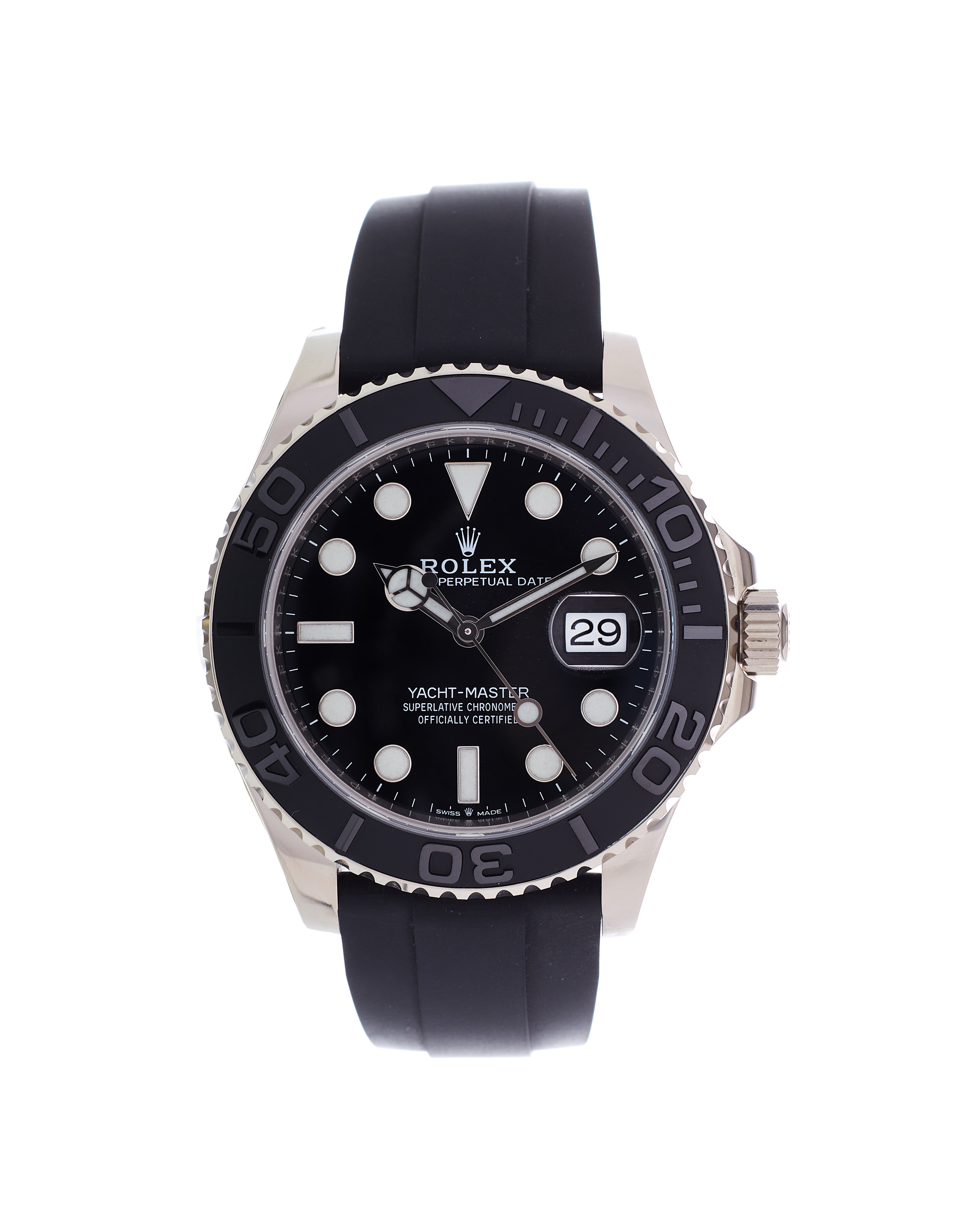 Diese spezifische Rolex Yacht-Master 226659 hat ein schwarz ziffernblatt mit einem kautschuk armband. Diese Rolex wurde einer gründlichen Prüfung der Wasserbeständigkeit, Genauigkeit, Funktionalität und des Zustands unterzogen, um den Grad der Überholung zu bestimmen, der zur Einhaltung unserer strengen Standards erforderlich ist. Sie wurde auch mit technischen Dokumenten und Herstelleraufzeichnungen verglichen, falls vorhanden, um Echtheit und einen einwandfreien Werdegang zu gewährleisten. Zu Ihrer Sicherheit verfügen alle unsere Uhren über eine 24-monatige Garantie. Einer unserer Poliertechniker hat die durch tägliche Abnutzung entstandenen Makel auf dem Gehäuse und dem Armband dieser Uhr entfernt, weshalb diese Uhr nicht mit der verbleibenden Herstellergarantie geliefert wird.